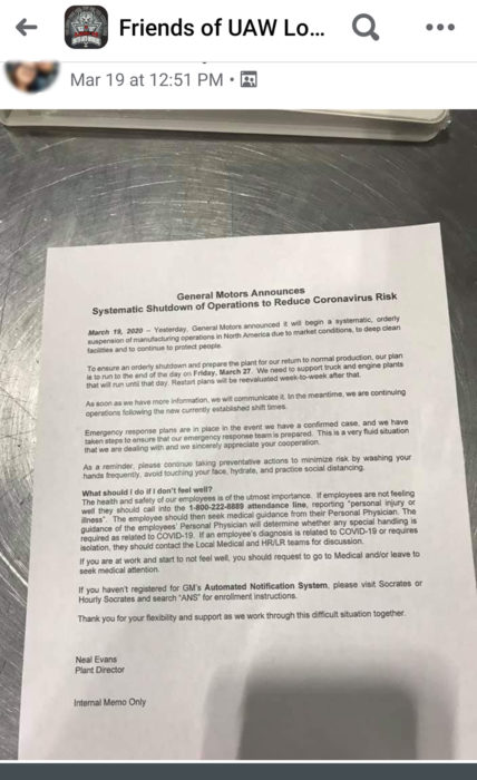 I work in an auto parts plant that’s organized with the UAW or United Auto Workers union and I’m a former steward and last year was active with the strike auto worker at my plant. Last week the governor ordered that 50-75% of the workforce needed to stay home and the day the plant manager sent out a letter saying our plant would stay open until the 27th [of March]. I was at home self-quarantining because I had recently travelled abroad so I started posting in our plant’s Facebook group about taking action and I posted articles about wildcat walks out that were happening in other UAW plants. On other union Facebook pages I saw that whole departments were announcing they were walking out.