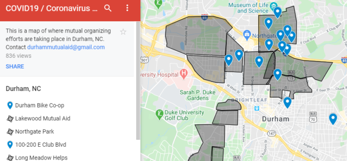 We also started a Durham citywide public Facebook group for mutual aid organizing here. Within less than a day, we already had over 300 members and active discussions going. Since then we’ve formed a dozen neighborhood committees, or pods, that are surveying residents using google forms and organizing responses.