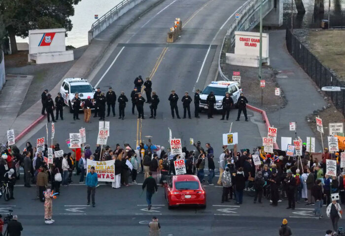 Demonstrators block the main entrance to Coast Guard Island in Alameda.