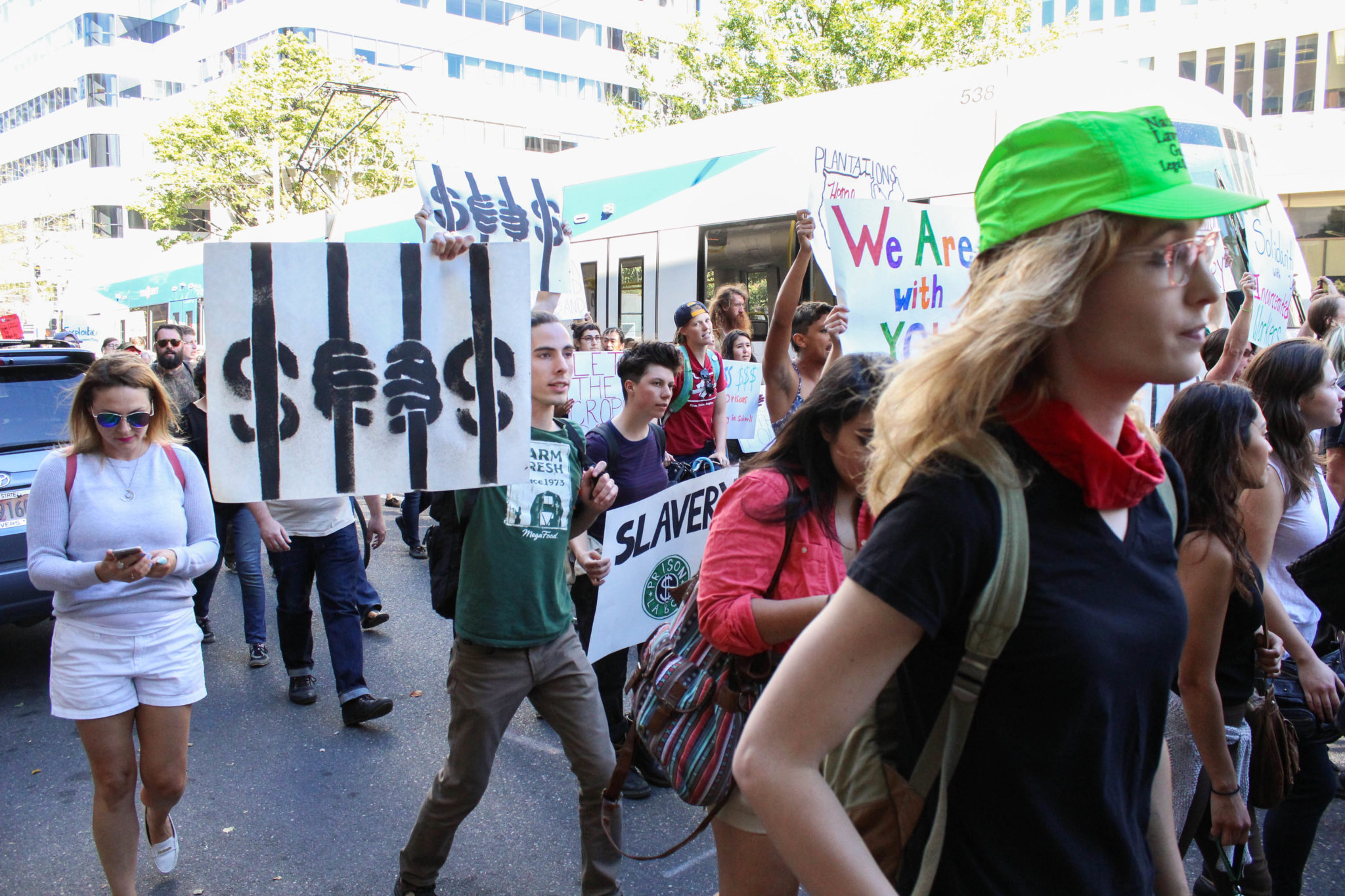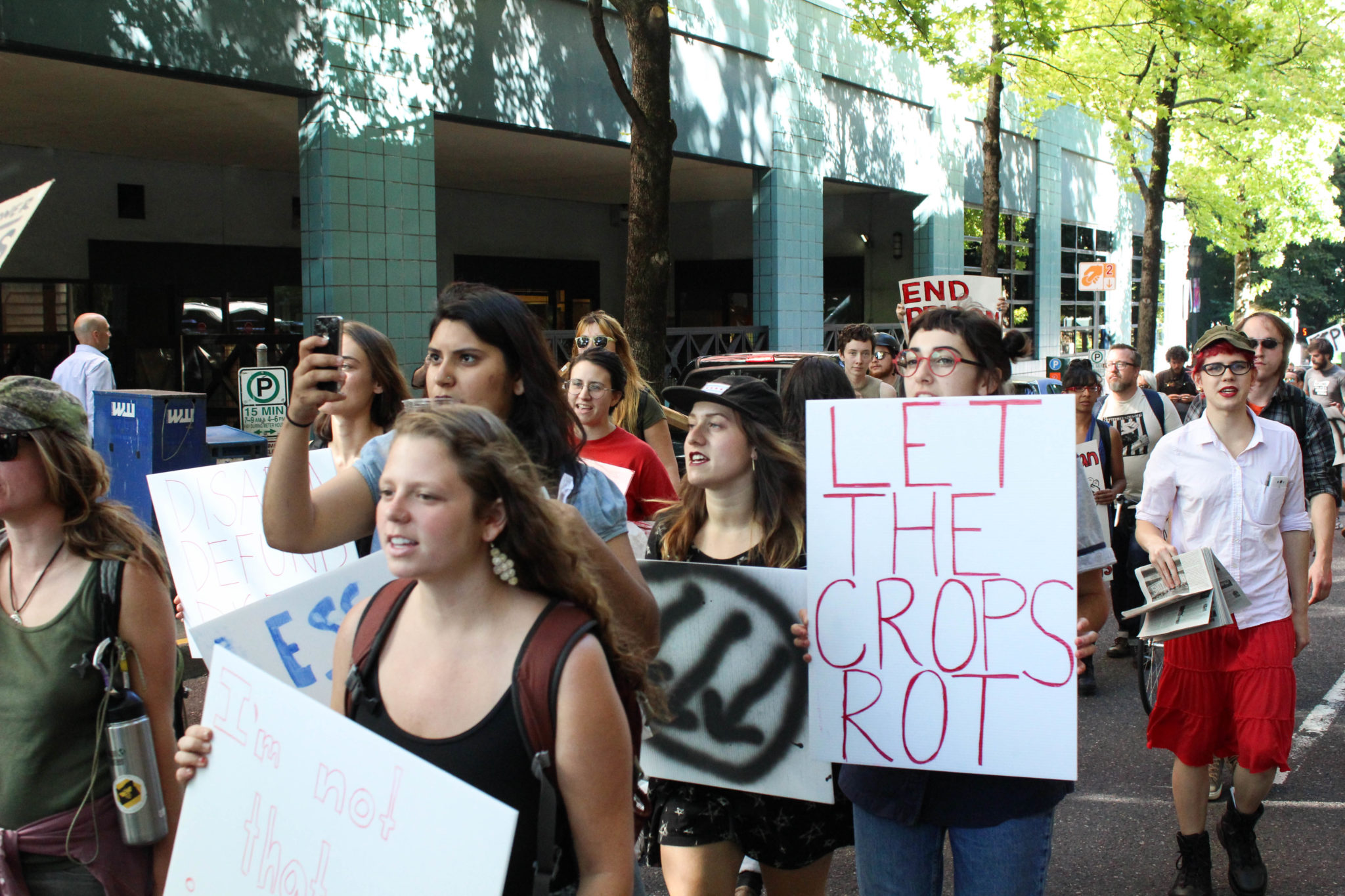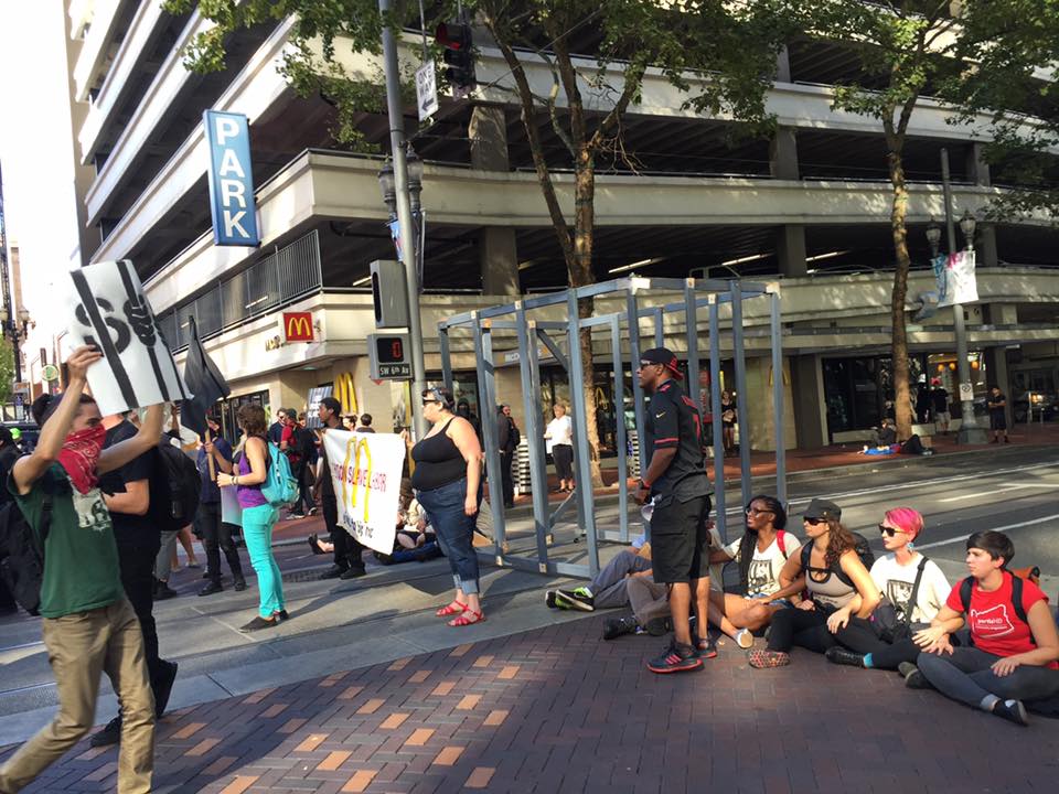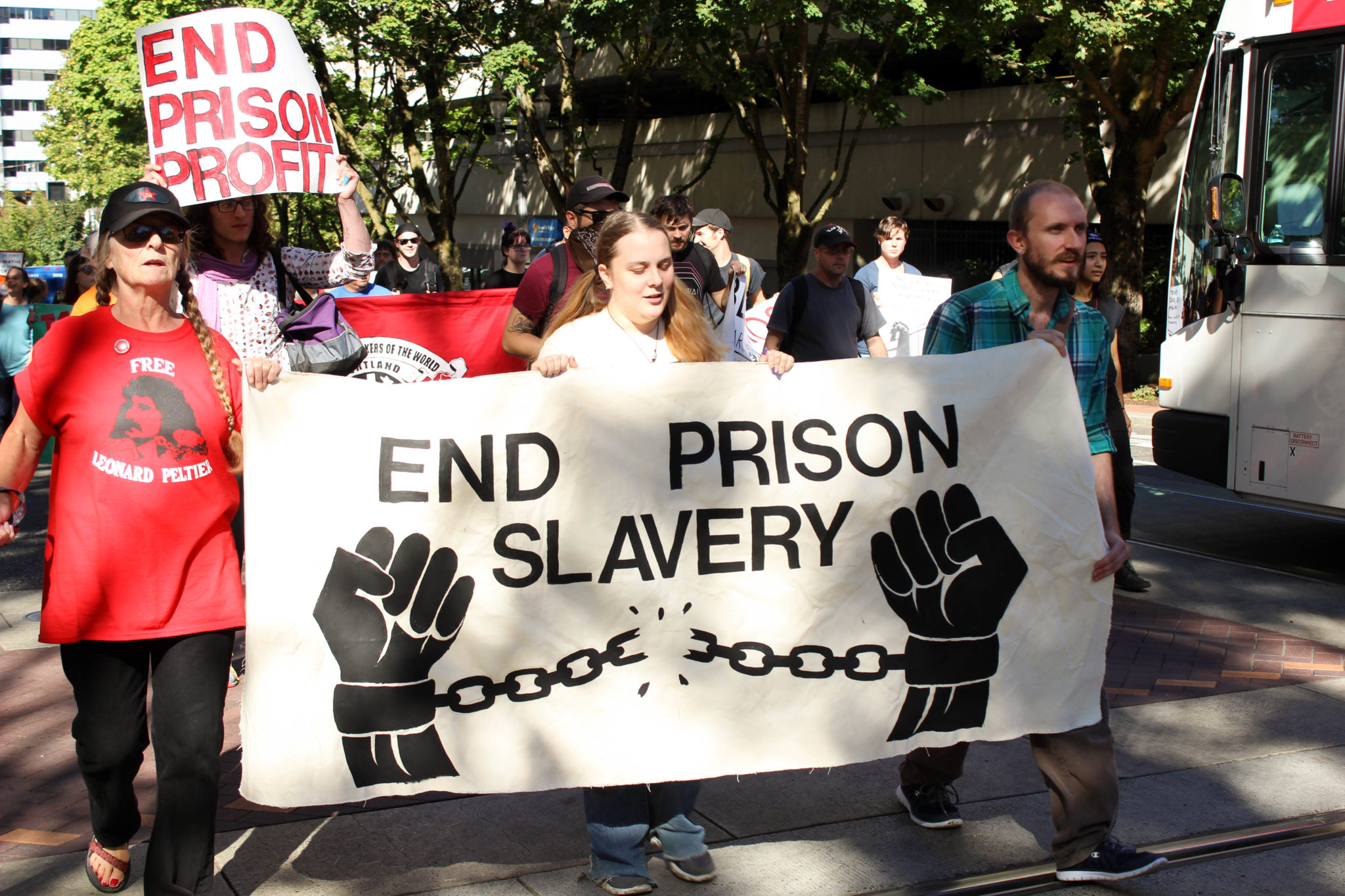 After several individuals and organizations spoke, protesters hit the streets with signs that targeted the systemic violence faced at the hands of the police. Portland Police began harassing protesters early on, trying to confiscate signs and arresting a participant before the march even began. Once on the road, protesters moved through the city, heading to corporate locations that use prison labor while reaping astronomical profits. This included McDonalds, which has been a target of movements like the Incarcerated Workers Organizing Committee for its use of prisoners for producing frozen meat patties.