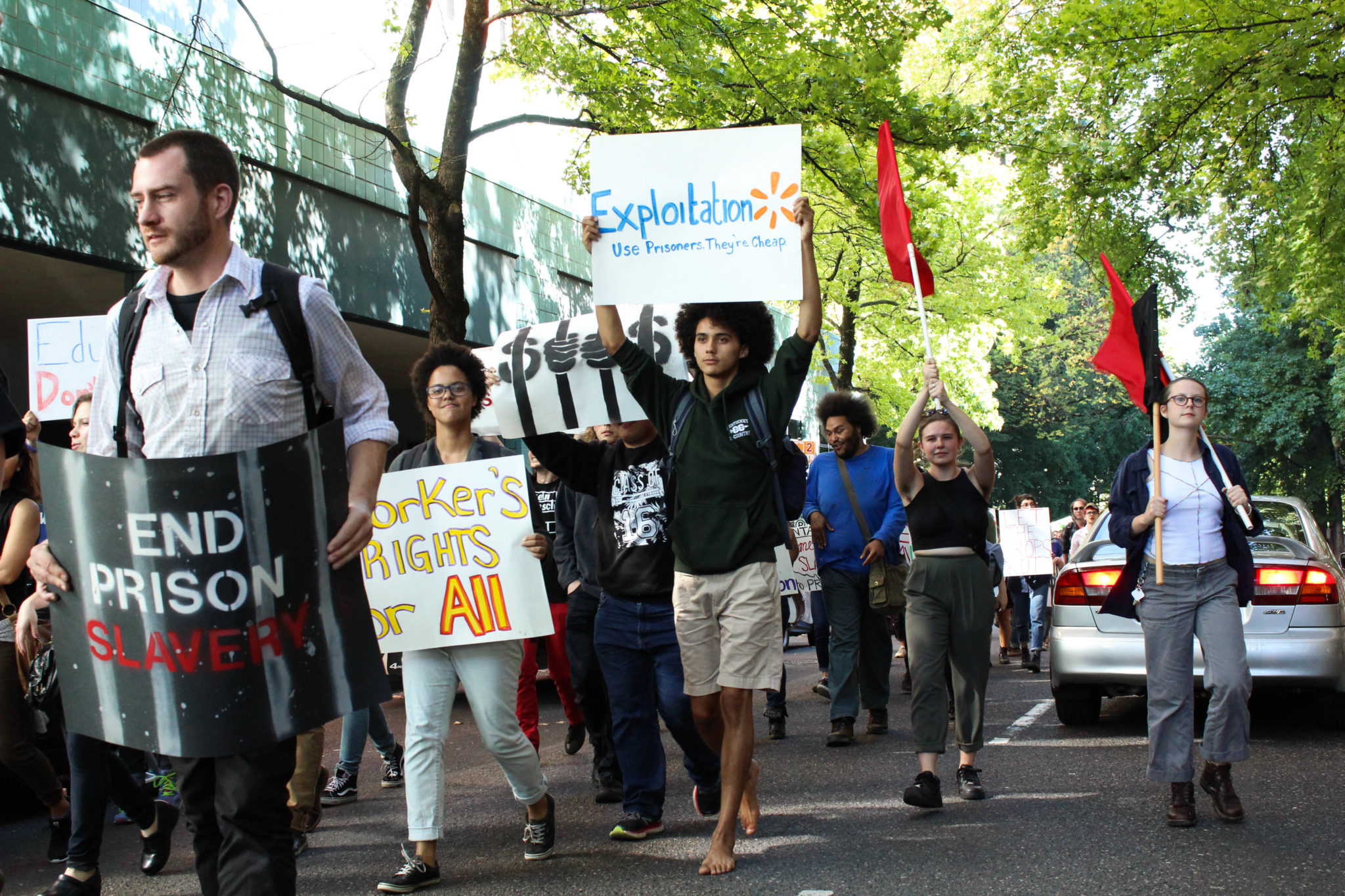 What this action shows more than anything is that a coordinated effort is taking place in Portland just as it is happening around the country. Centering with the Incarcerated Workers Organizing Committee, a project of the Industrial Workers of the World, groups from around the city came together with a vision of a world without prisons. While the action was intended to target the injustices of racial profiling, work and living conditions for inmates, and the corporate exploitation of slave labor, it was a deeply held abolitionist politic that united the radical groups who stood in solidarity. It was the desire to rid society of the punitive systems of control that are necessitated by global capitalism, white supremacy, heteropatriarchy, and all forms of intersecting hierarchy and domination.
