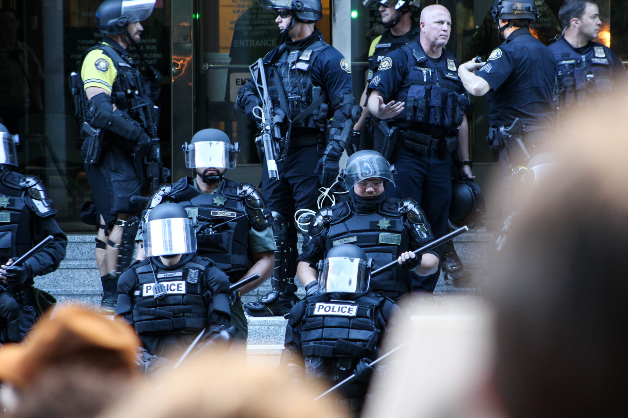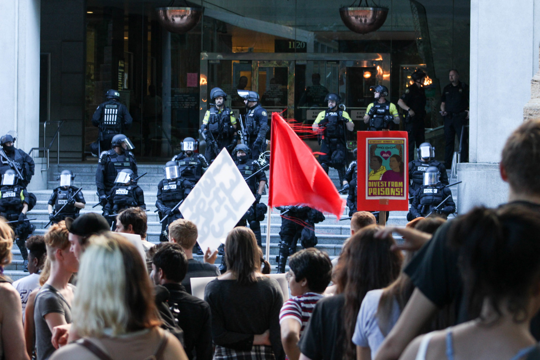The police eventually showed up in riot gear and took to a line formation across the street. Announcing that protesters had blocked traffic they were ordered to disperse. Later, protesters returned to the Justice Center to hold a noise demonstration that can be heard by inmates on the inside, a show of solidarity across the double paned glass. They were met with a row of riot police who violently pushed them back, forcing them into the park. As the demonstration continued, police periodically moved in flash attacks on the crowd, shooting pepper spray and picking off specific people that they say had stepped out into the road.