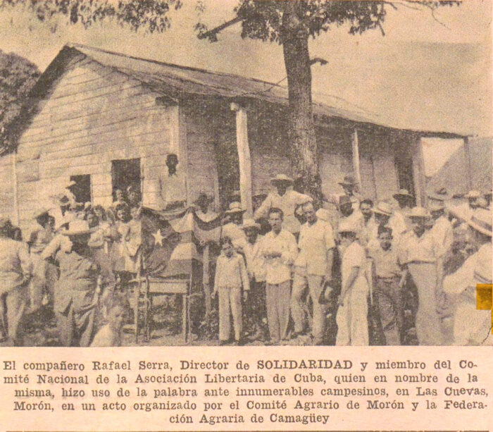 Translation of caption: “Comrade Rafael Serra, Director of Solidaridad and member of the National Committee of the Asociación Libertaria de Cuba (ALC), who, on behalf of the organization, addressed countless peasants in Las Cuevas, Morón, at an event organized by the Morón Agrarian Committee and the Camagüey Agrarian Federation. Solidaridad, July 1947